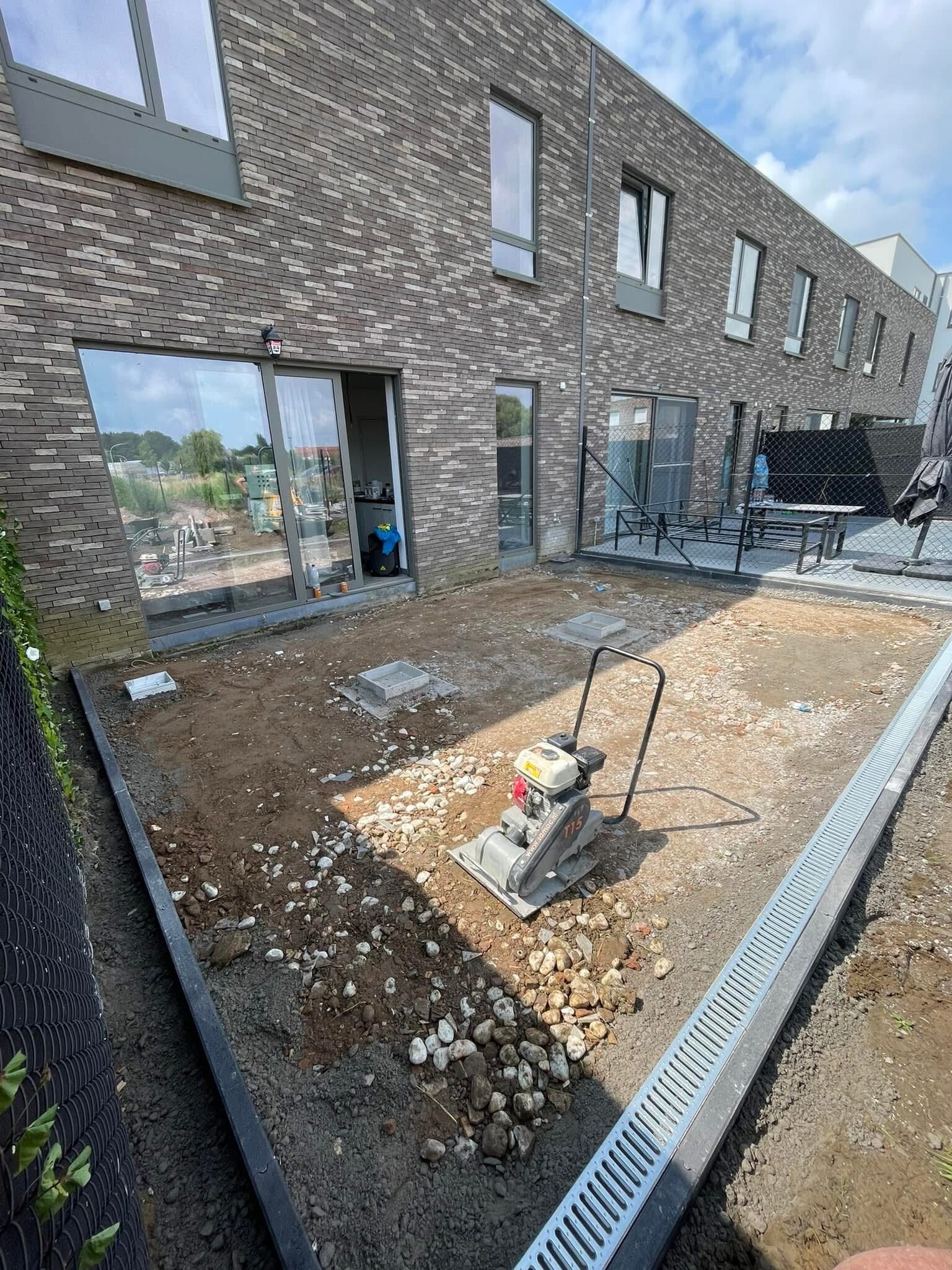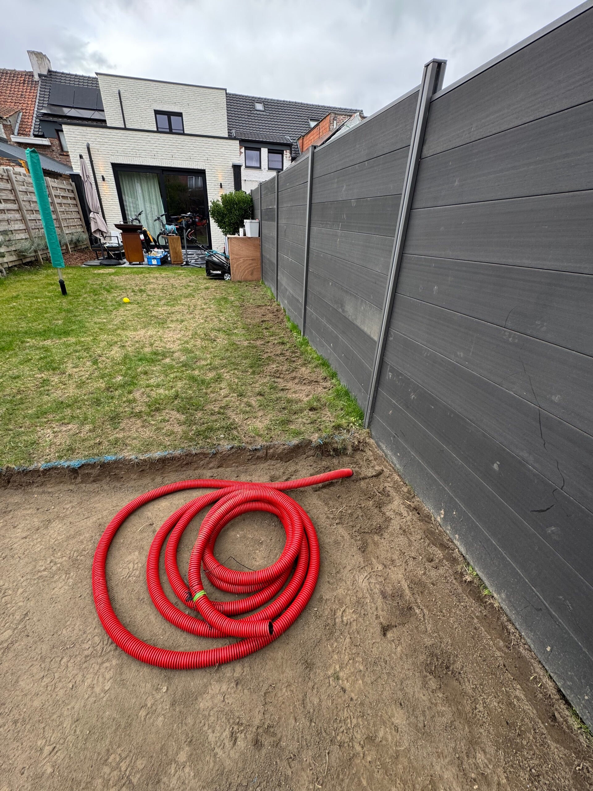 We zijn gestart met het afgraven van de graszoden om een vlak en stabiel terrein te bekomen.Daarna hebben we een flexibele wachtbuis geplaatst van de betonplaat tot aan de woning, zodat er later eenvoudig stroom kan worden aangesloten. Betonnetten gelegd en de flexibel op de juiste afstand gepositioneerd. Alles netjes dichtgebetonneerd voor een duurzame en egale fundering. Omdat de tuin achteraan wat afhelde, hebben we de grond licht opgehoogd, zodat alles mooi gelijk ligt met de rest van het gazon.