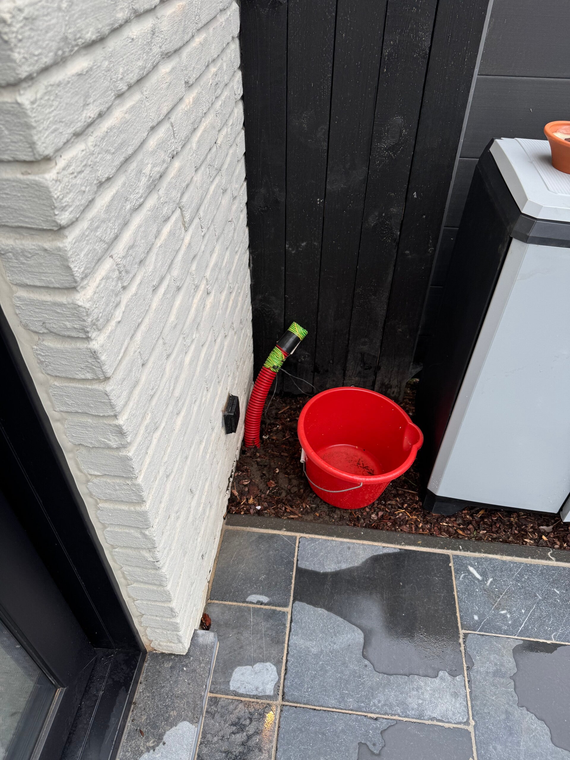 Aansluitingen netjes weggewerkt met antraciete Niko-afwerking, dus servicevriendelijk voor later. en de regenafvoer? Ook daar is aan gedacht! Beide bestaande regenafvoeren werden slim geïntegreerd waarvan één door de balk en één door het glas.
